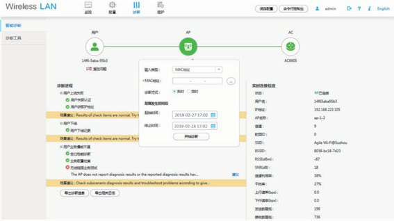l 基于用戶、AP、WLAN AC 三個(gè)維度的一鍵式智能診斷,支持實(shí)時(shí)與定時(shí)診斷,并且針對(duì)故障問題提供可行性處理建議。