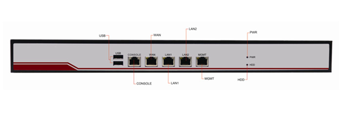 設(shè)備正面:接口:USB*2,CONSOLE*1,WAN RJ45*1,LAN1~LAN2 RJ45*2,MGMT RJ45*1